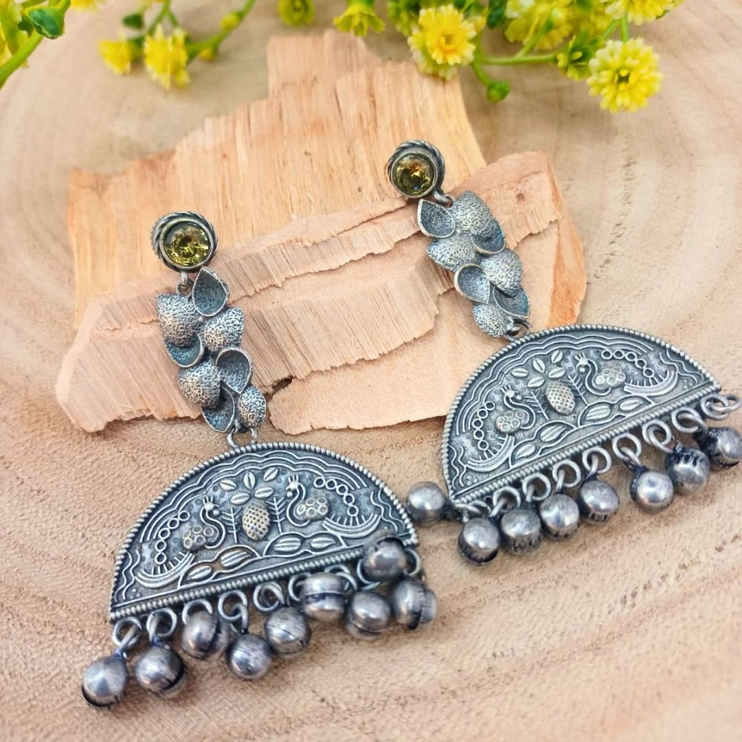 These beautiful earrings, from our Jewar Collection, feature a unique semi-circle design. Moreover, delicate leaf and ghoogri details enhance their charm. Additionally, the yellow stone adds a vibrant touch. Furthermore, the push stopper ensures secure wear.