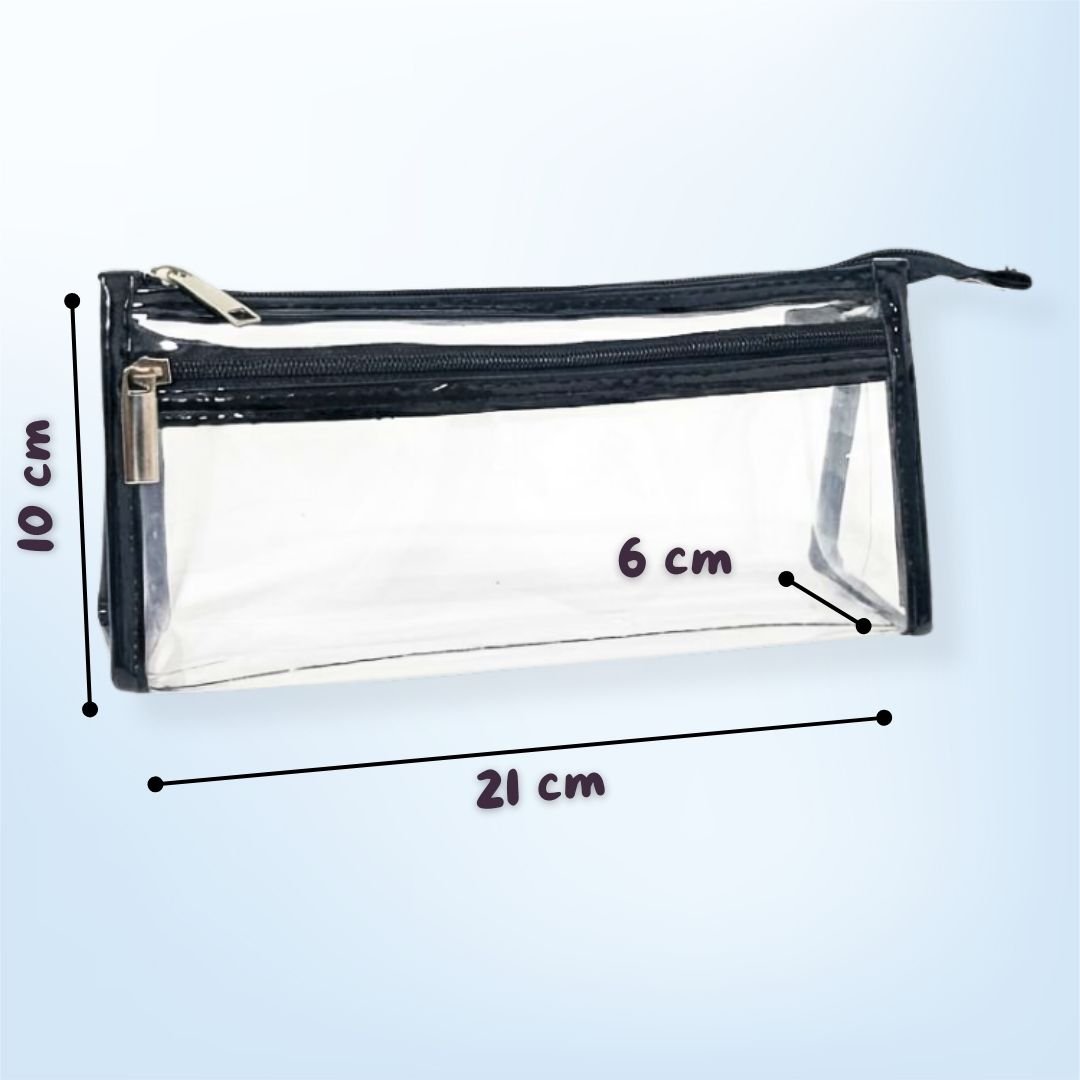 A sleek black transparent pencil pouch with durable zippers and PU leather trim. Perfect for school, office, and everyday organisation.