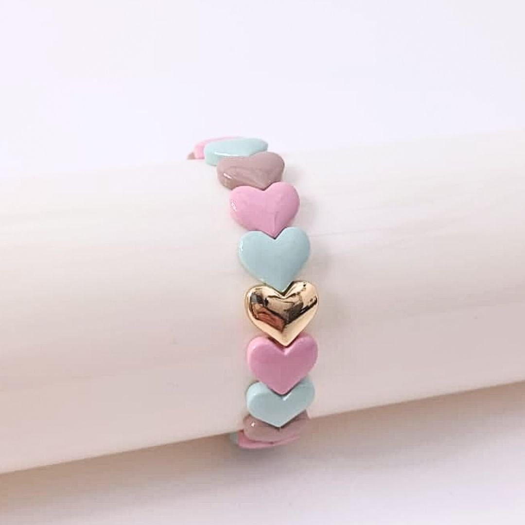 Designed for both comfort and style, this bracelet features smooth, heart-shaped beads in a variety of trendy pastel and gold tones.