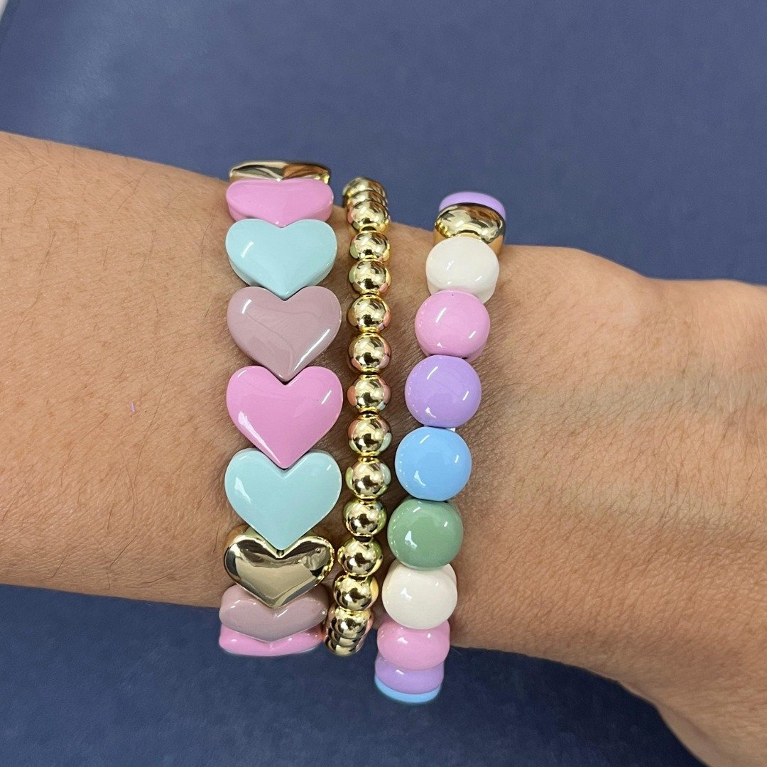 Pastel Heart Bead Bracelet: Featuring enamel-coated heart-shaped beads in sweet shades like mint, pink, nude, and lilac, this bracelet adds a pop of charm to any wrist.