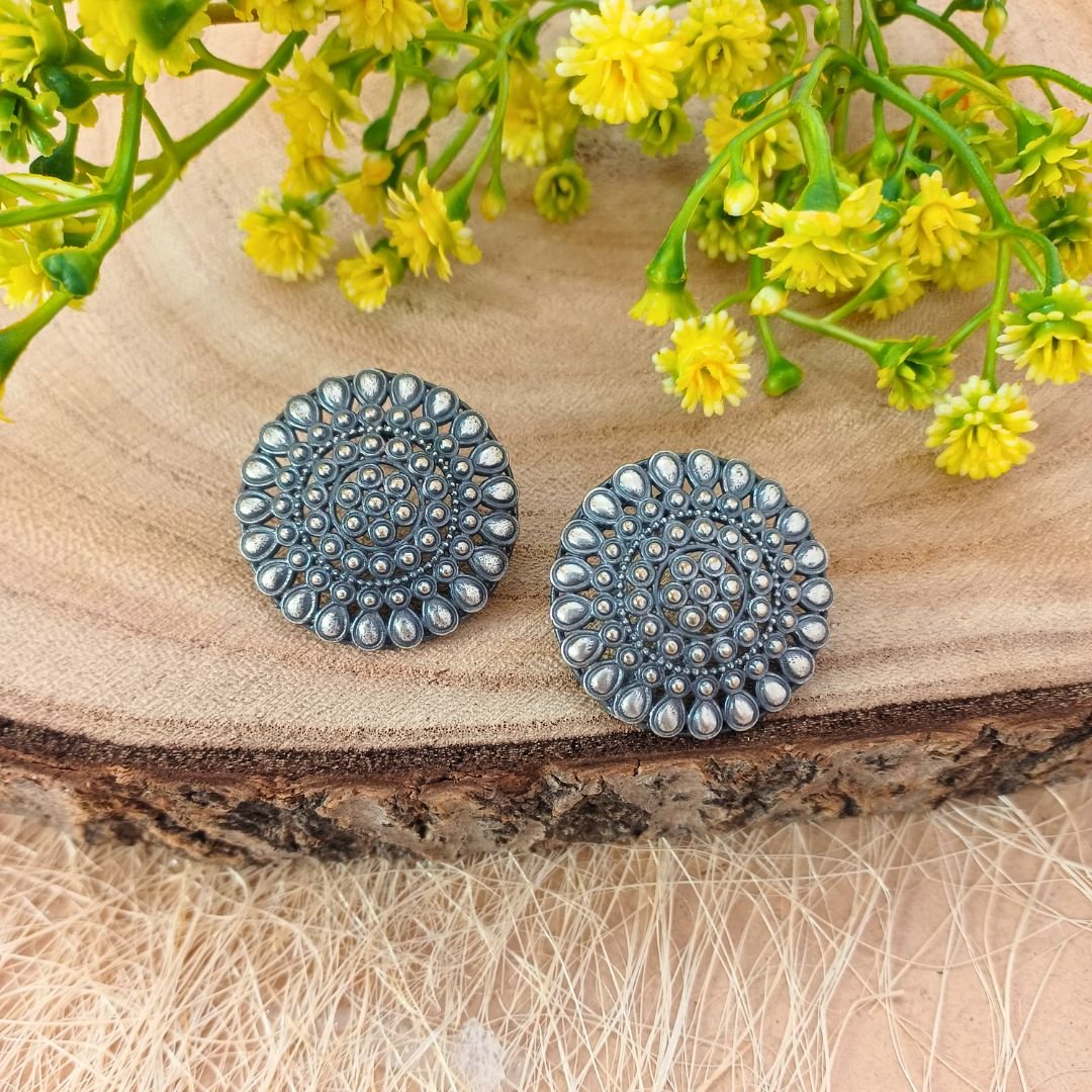 These earrings speak volumes without being overpowering. The flower design, combined with the detailed texture and oxidized finish, creates an aesthetic that is both classic and contemporary. Therefore, they make a perfect accessory for those who appreciate understated grace.