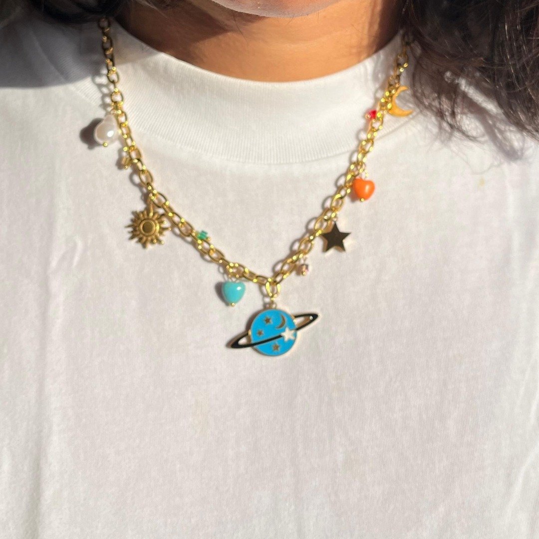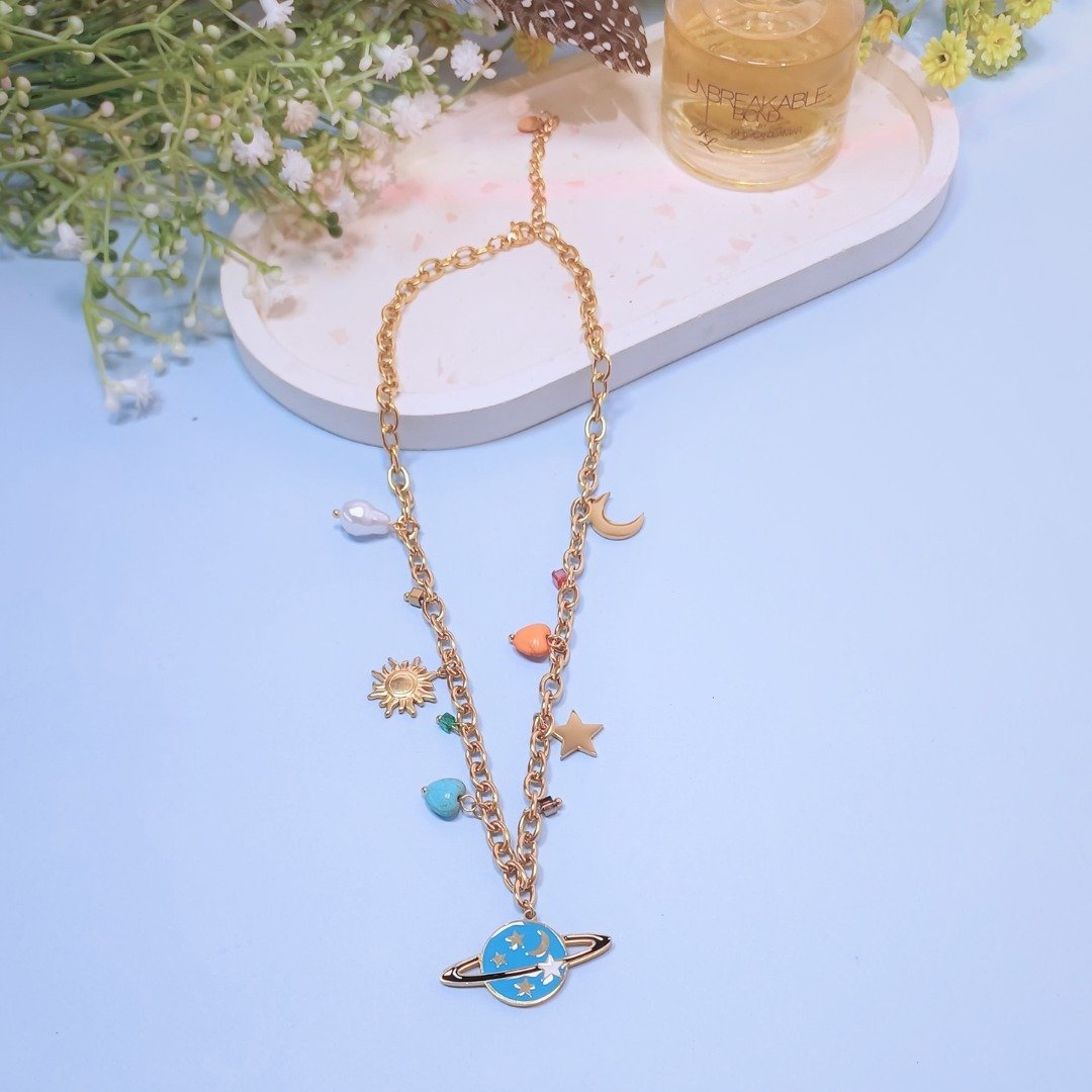 The Cosmic Bloom Necklace captures the essence of celestial beauty with its radiant gold-plated chain and an array of cosmic-inspired charms. Featuring a bold blue Saturn pendant accented with golden stars, a crescent moon, a glowing sun, and tiny colorful hearts, this piece embodies a dreamy, playful aesthetic.