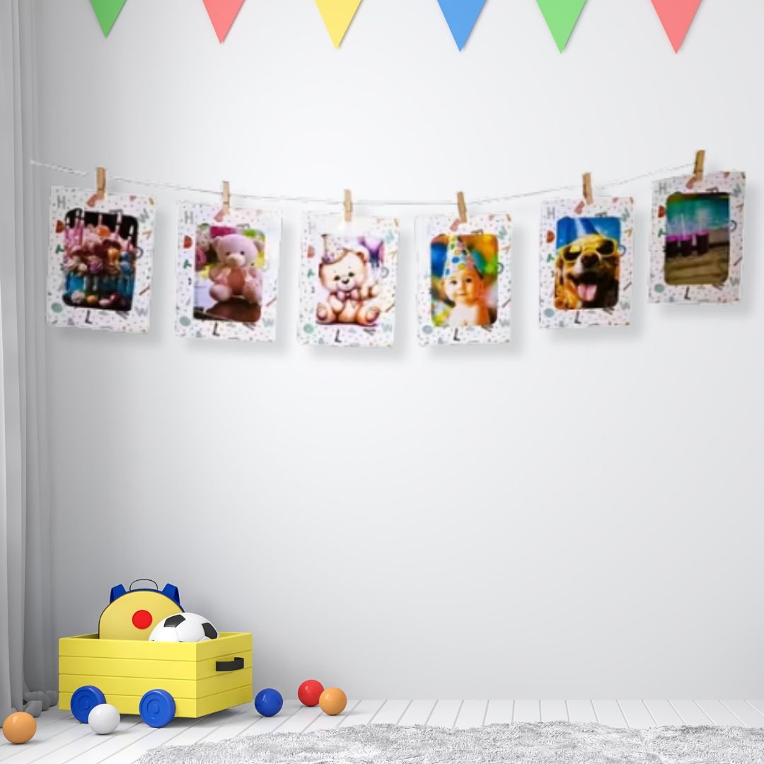 Bring a burst of charm to any wall with this 6PCS DIY Hanging Photo Frame Set. Cute alphabet print, easy setup, perfect for birthdays or nursery décor.