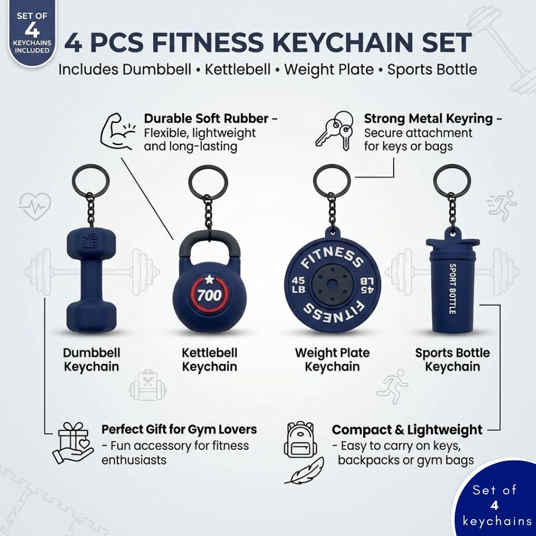 Show your fitness lifestyle with this Navy Blue Fitness Keychain Set of 4. Featuring miniature dumbbell, kettlebell, weight plate, and sports bottle designs, these stylish keychains are perfect for keys, backpacks, and gym bags.