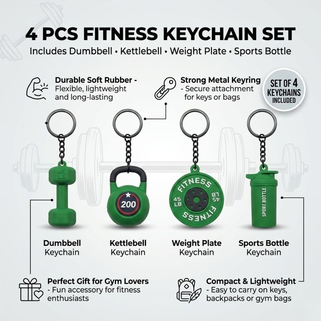 This Green Fitness Keychain Set of 4 is designed for people who love fitness and workouts. The set includes miniature gym equipment designs that add a sporty touch to your everyday accessories.
