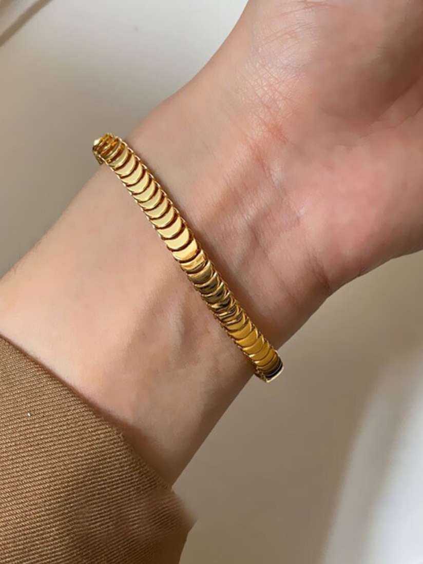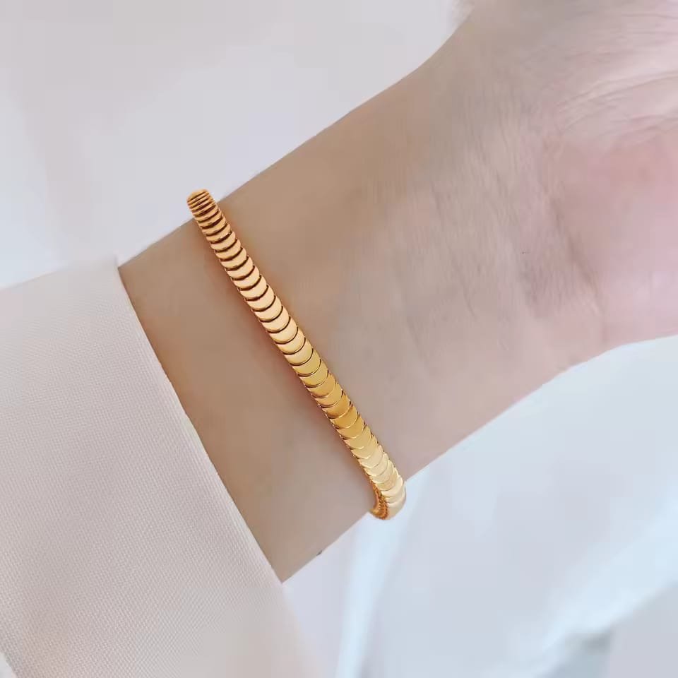 Crafted from high-quality stainless steel and finished in an 18K gold-tone plating, this bracelet draws inspiration from classic Italian herringbone chains—but with a lighter, more wearable structure. Tiny crescent-shaped links form a flat, snake-like pattern that catches and reflects light with every movement. The result is a liquid gold effect that wraps gently around your wrist.