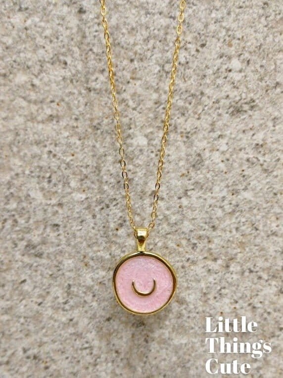 This gorgeous necklace features a pink base with a gold horseshoe charm hung on a delicate golden chain.