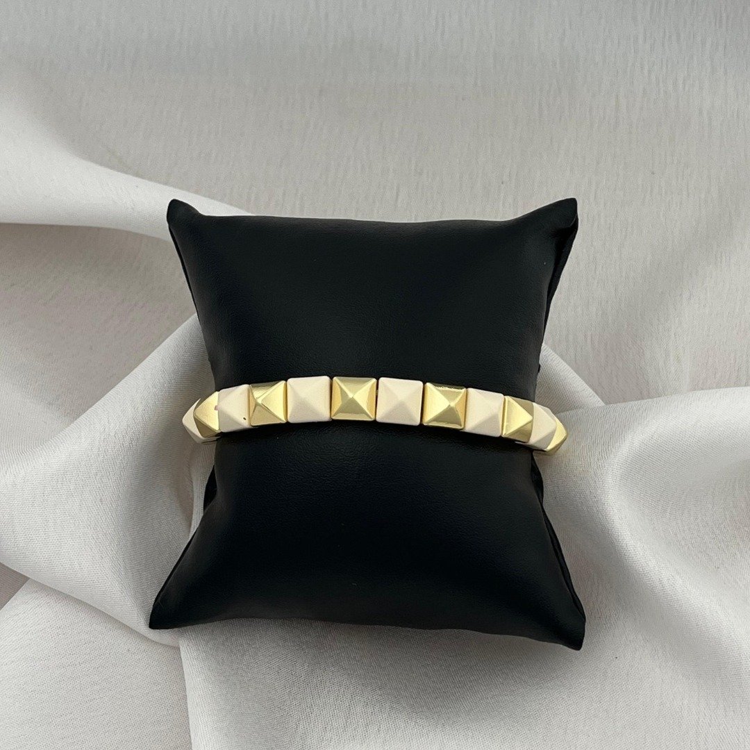 With its seamless blend of matte ivory enamel and gleaming gold-tone pyramid studs, this bracelet brings texture, tone, and pattern together in perfect harmony. Each triangle is a deliberate contrast—soft and striking, matte and shine—creating a layered look that’s both balanced and bold.