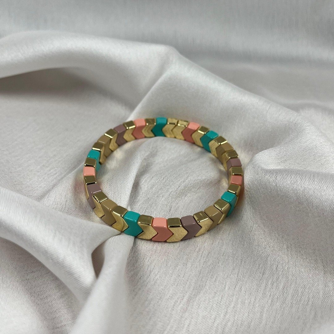 Bring modern geometry to your stack with the Ivory Triangle Harmony Bracelet—a harmonious blend of creamy enamel triangles and gold-tone pyramid studs on a flexible stretch core. Alternating matte ivory triangles and mirror-polish gold studs form an architectural band that sits sleekly against the skin. Despite its bold profile, the approx. 14 g weight makes it comfortable for day-long wear.