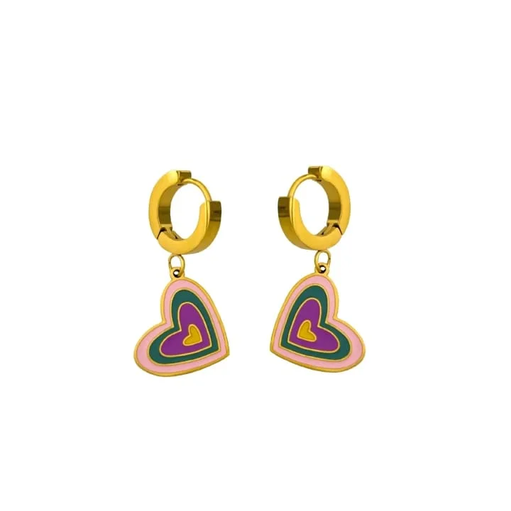 Each earring features a vibrant multicolor heart charm made with smooth enamel and attached to a high-quality gold-plated hoop. The enamel adds a glossy pop of color, while the gold plating ensures durability and a premium shine that lasts. Lightweight and skin-friendly, these earrings are comfortable enough for all-day wear without irritation.
