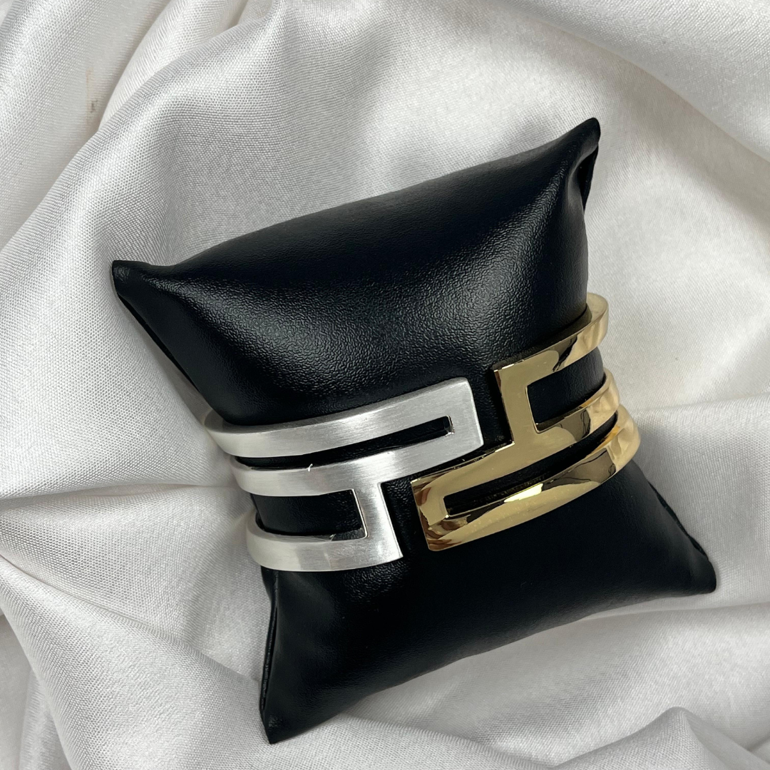 Step into a world where modern artistry meets timeless allure with the Ecliptic Embrace Cuff Bracelet by MetalWhispers. Thoughtfully designed to make a statement without saying a word, this exquisite piece is a refined blend of sleek geometry, dual-tone sophistication, and openwork craftsmanship. Ideal for the modern muse who values both subtlety and style, the Ecliptic Embrace is more than just a bracelet — it’s wearable art.
