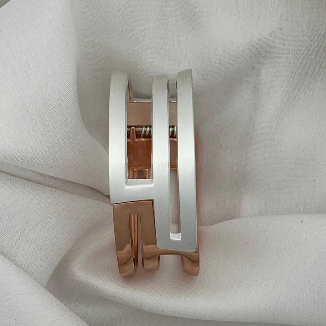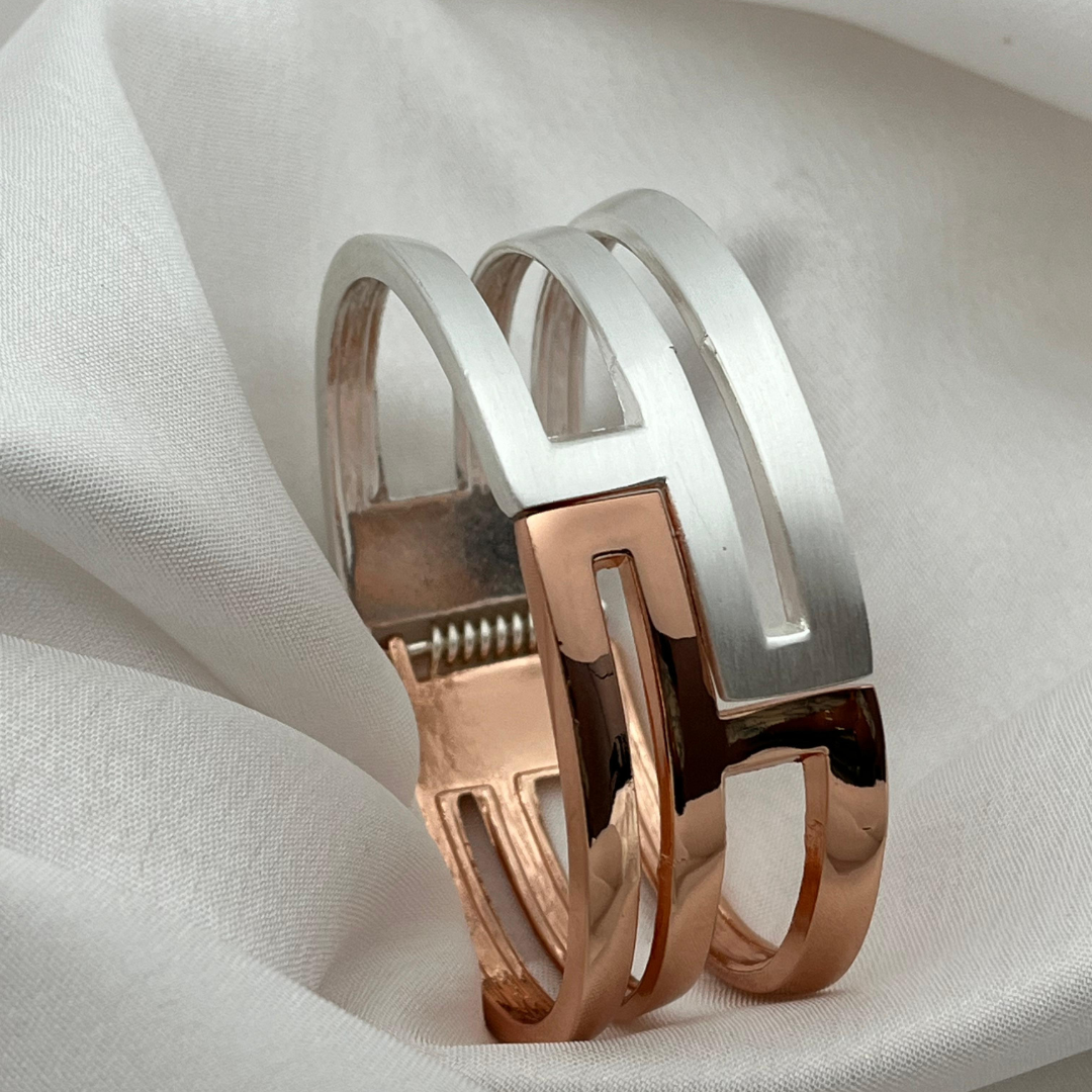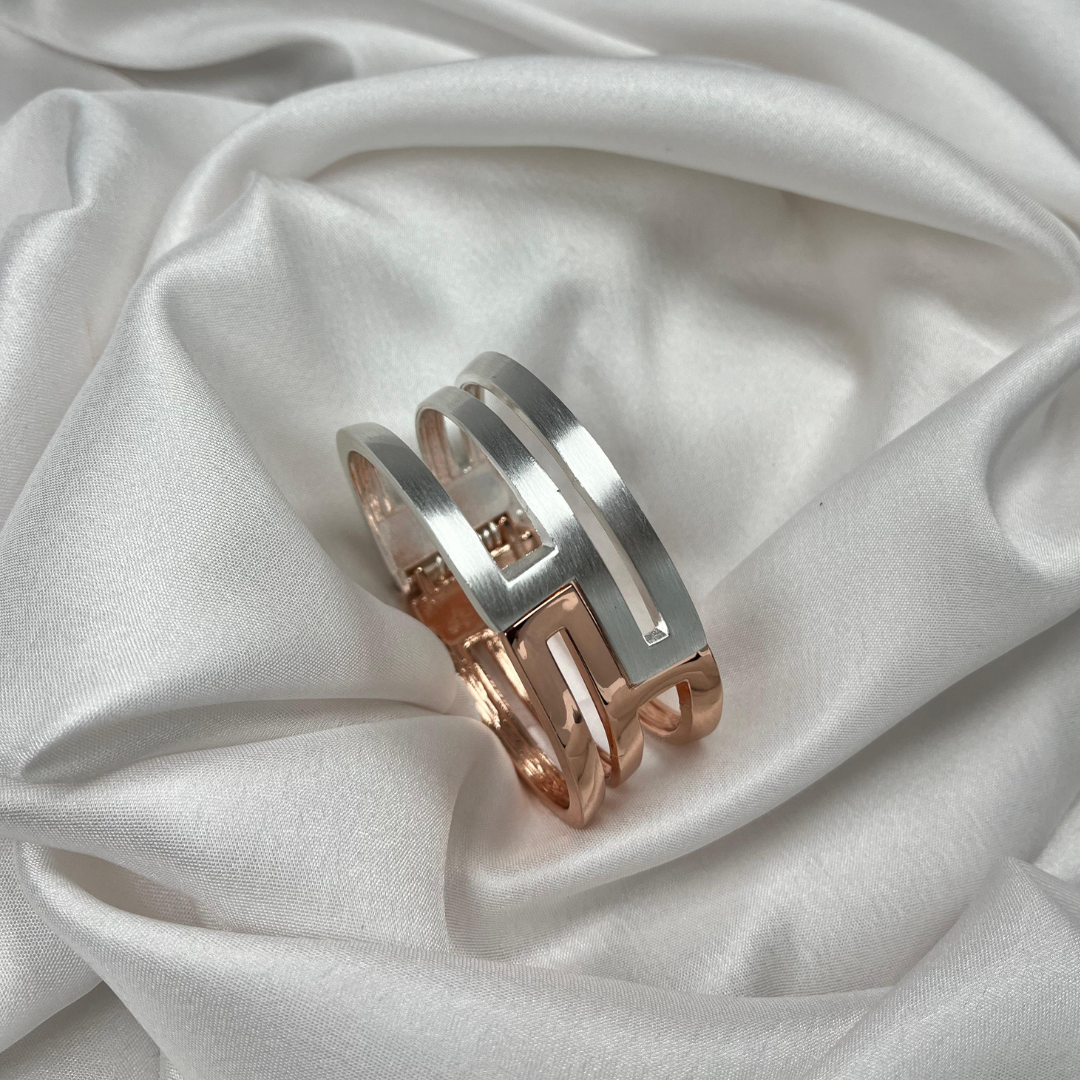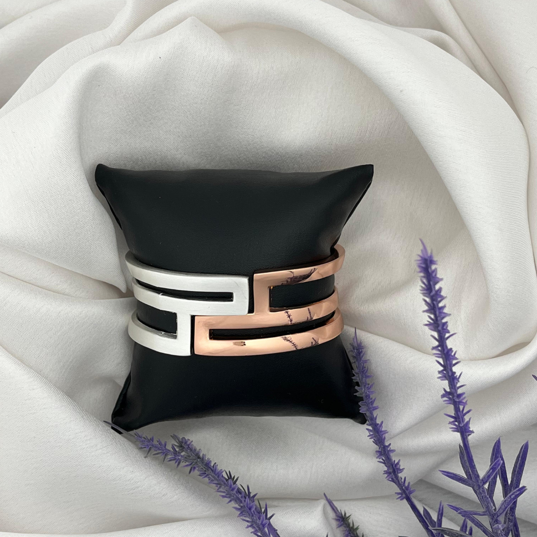 At the heart of its design lies the harmonious interplay of shimmering silver and warm rose gold tones. These two contrasting metals are interwoven in a bold geometric pattern that captures the eye and reflects light with every movement. The striking juxtaposition of color and shape creates a visual rhythm that draws attention, while still maintaining an understated elegance perfect for daily wear.