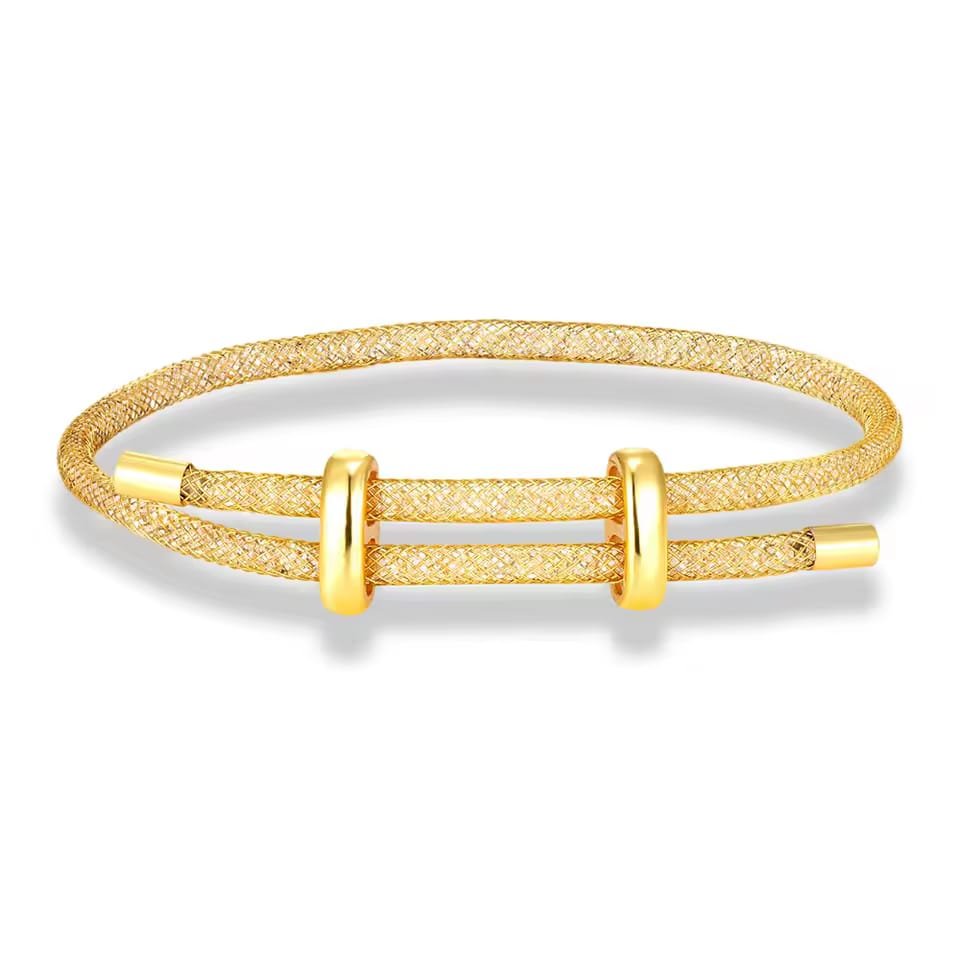 The double-wrap design creates a layered look that’s both effortless and chic. The tightly woven mesh offers a smooth, flexible fit, while two polished gold-tone sliders and matching gold-capped ends introduce a touch of luxury. Lightweight and comfortable, this bracelet moves with you—perfect for daily wear or elevated moments.