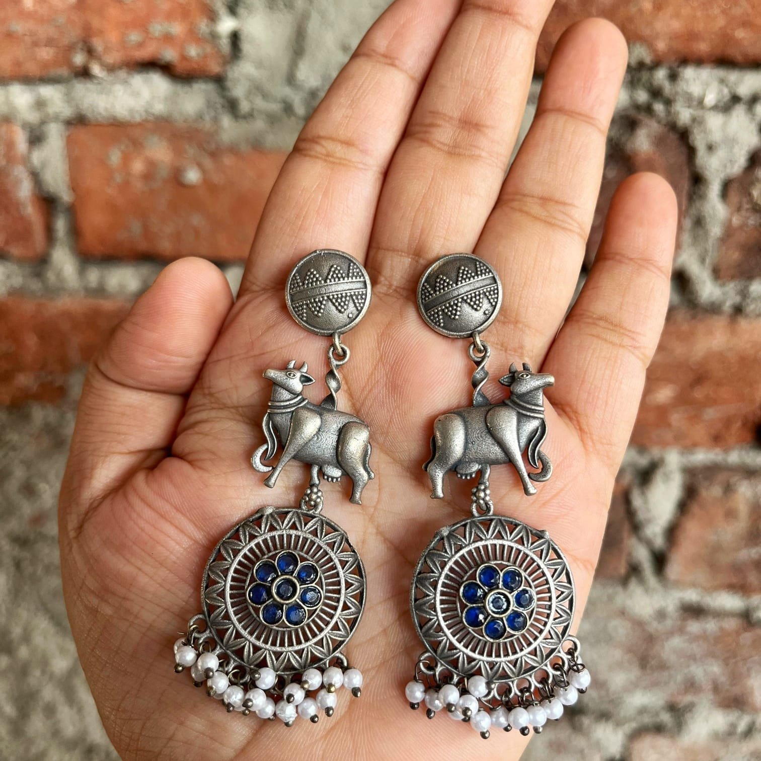These exquisite Nandi dangler earrings are handcrafted in brass and finished with a classic oxidised silver look.