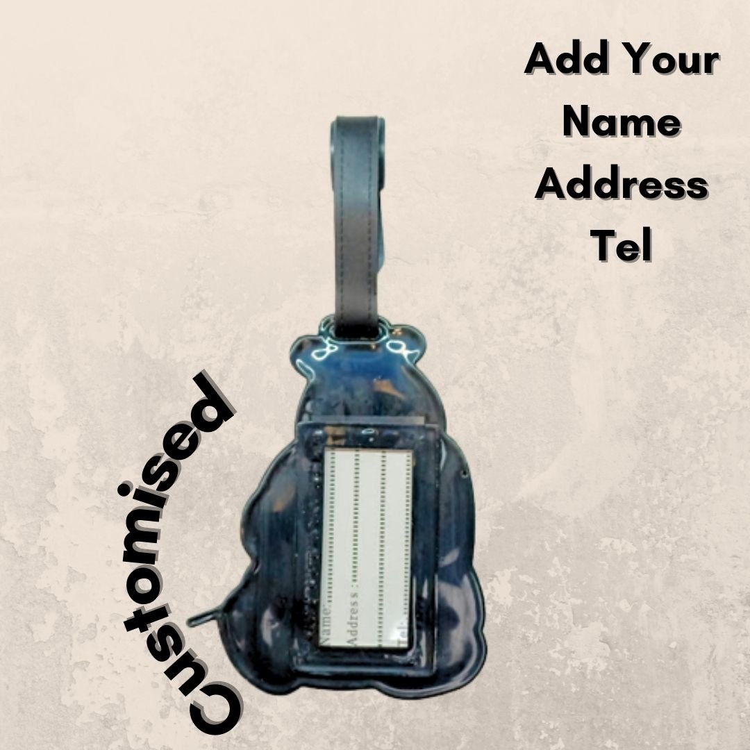 It features a clear window for your contact information and an adjustable strap for easy attachment. Perfect for adding a touch of personality to your travels.