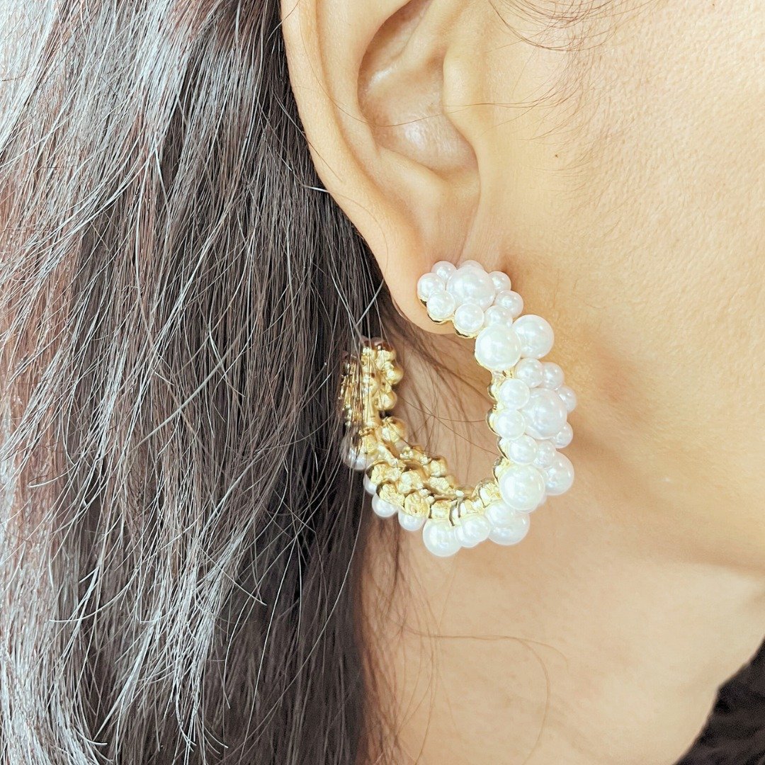 The open-hoop silhouette gracefully frames the face, enhancing natural features. Asymmetrically placed pearls add depth and dimension, making these earrings a standout accessory for any occasion.