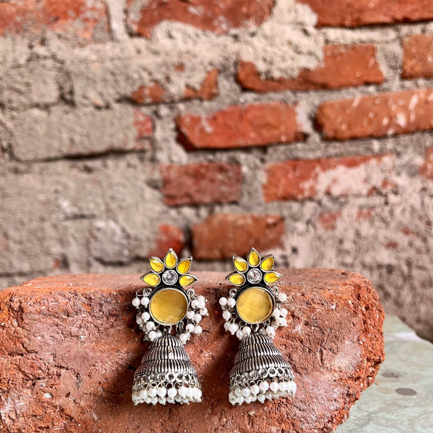 These stunning floral jhumka earrings are a perfect blend of tradition and modernity. The intricate design, adorned with vibrant yellow stones with tiny pearl hangings, adds a touch of elegance and a pop of color to any outfit.