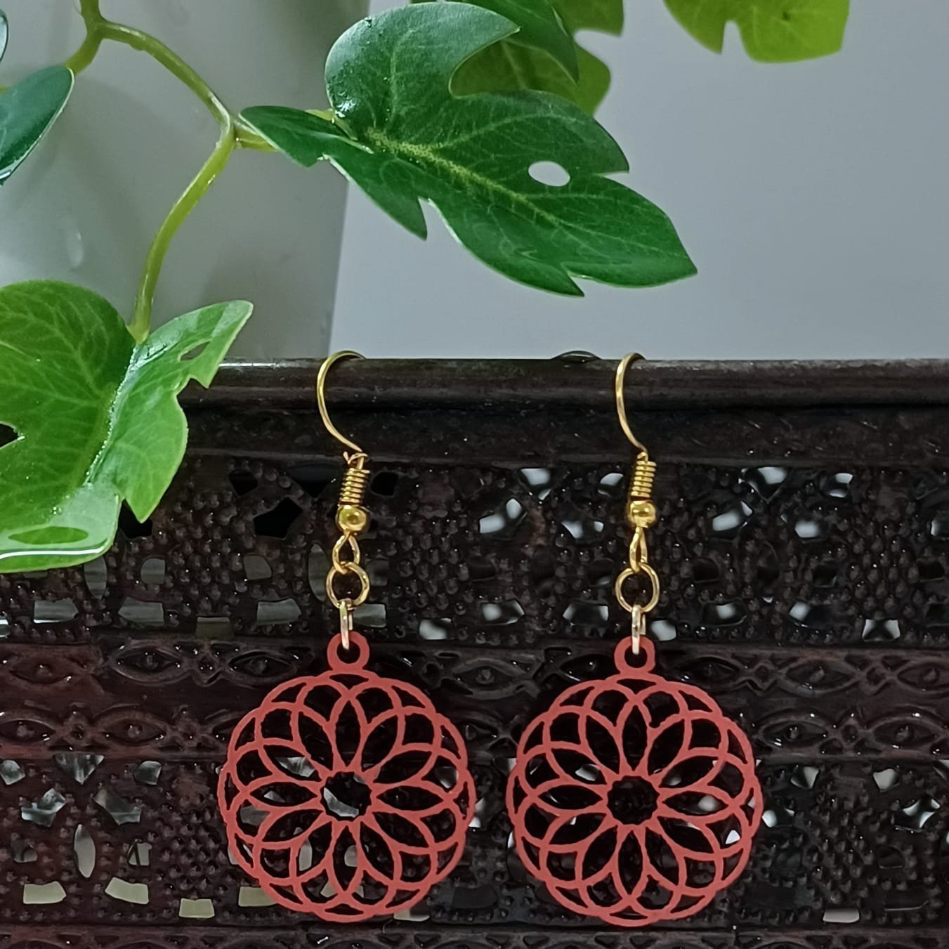 Enjoy these amazing wood-made Mandala earrings. These dainty dangle earrings feature an eye-catching pattern that enhances the wood grain’s inherent beauty.