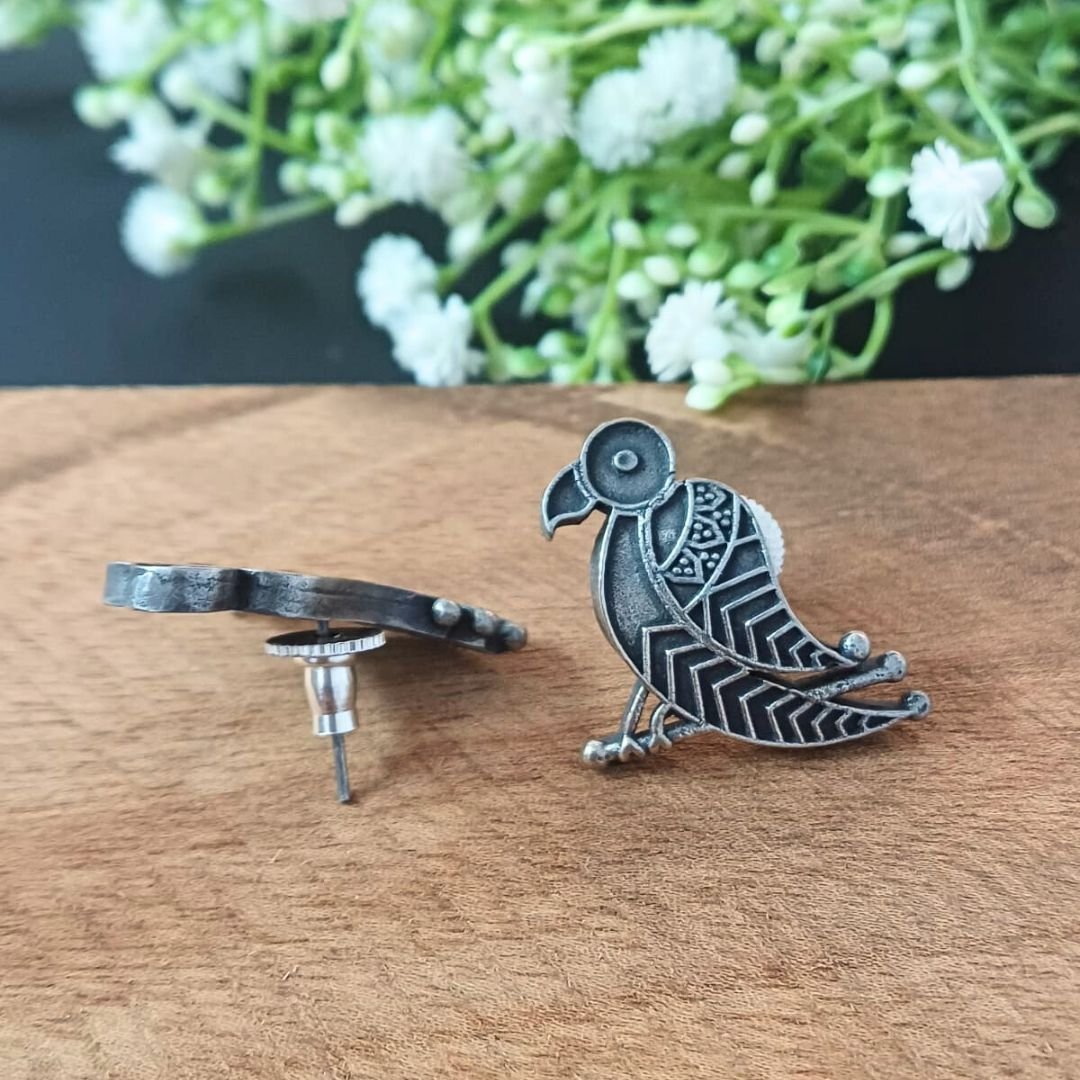 Crafted with a silver lookalike finish and oxidized for an antique touch, these unique earrings feature an intricate parrot design. Add a touch of whimsy to any outfit.