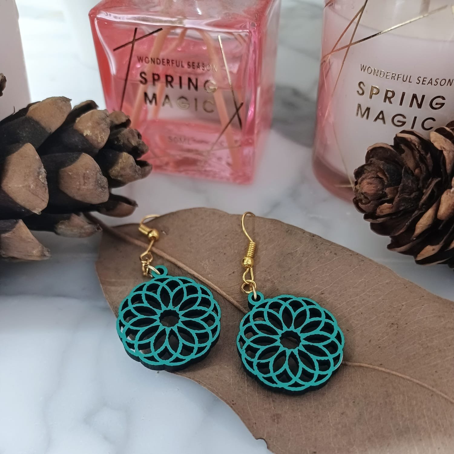 Unleash your bohemian side with these teal wooden mandala earrings.