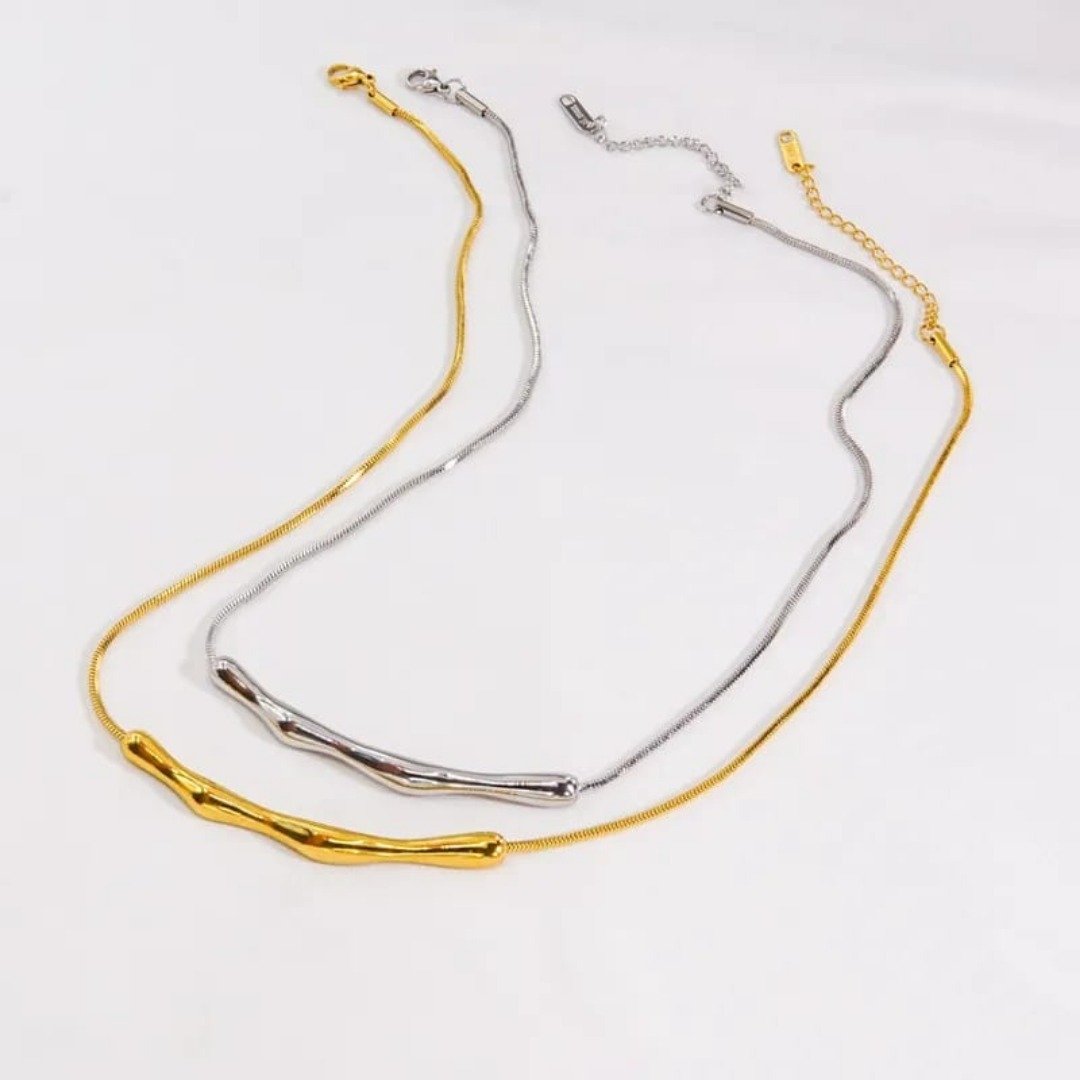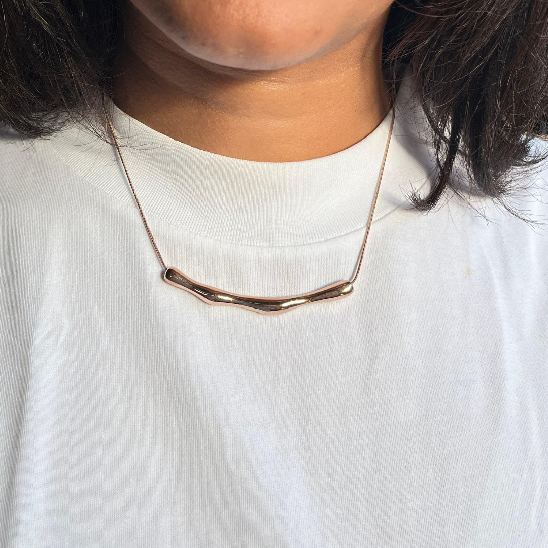 Inspired by the fluidity of nature and the quiet elegance of twilight, the Twilight Bend Necklace embodies modern minimalism with an organic twist. The sculptural gold plated pendant mimics the gentle curve of a bending branch, capturing the effortless grace of natural forms. Its smooth, undulating surface reflects light beautifully, creating a subtle shimmer that enhances its sleek aesthetic. Suspended from a delicate yet sturdy chain, this necklace exudes understated sophistication, making it a versatile statement piece for any jewelry lover.