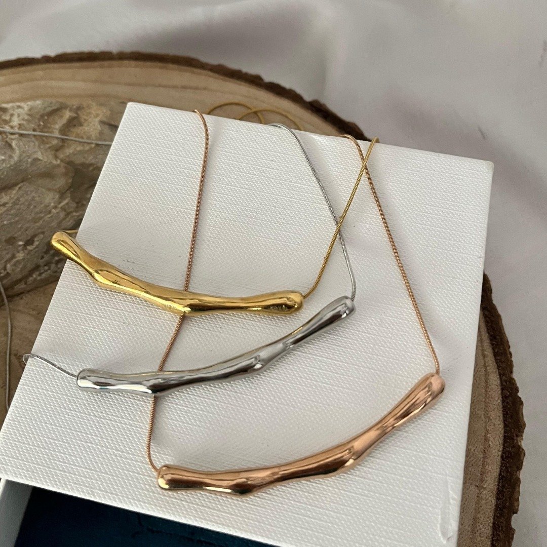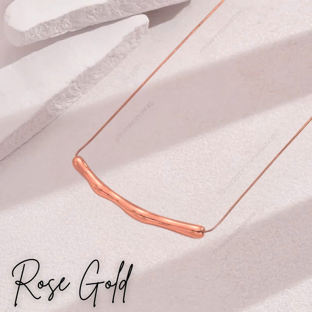 Inspired by the fluidity of nature and the quiet elegance of twilight, the Twilight Bend Necklace embodies modern minimalism with an organic twist. The sculptural rose gold pendant mimics the gentle curve of a bending branch, capturing the effortless grace of natural forms. Its smooth, undulating surface reflects light beautifully, creating a subtle shimmer that enhances its sleek aesthetic. Suspended from a delicate yet sturdy chain, this necklace exudes understated sophistication, making it a versatile statement piece for any jewelry lover.