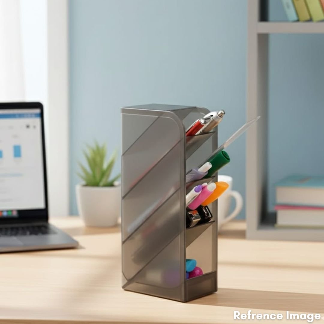 A sleek premium-plastic desk organizer with four vertical compartments designed to store pens, pencils, markers, and office supplies while saving desk space.