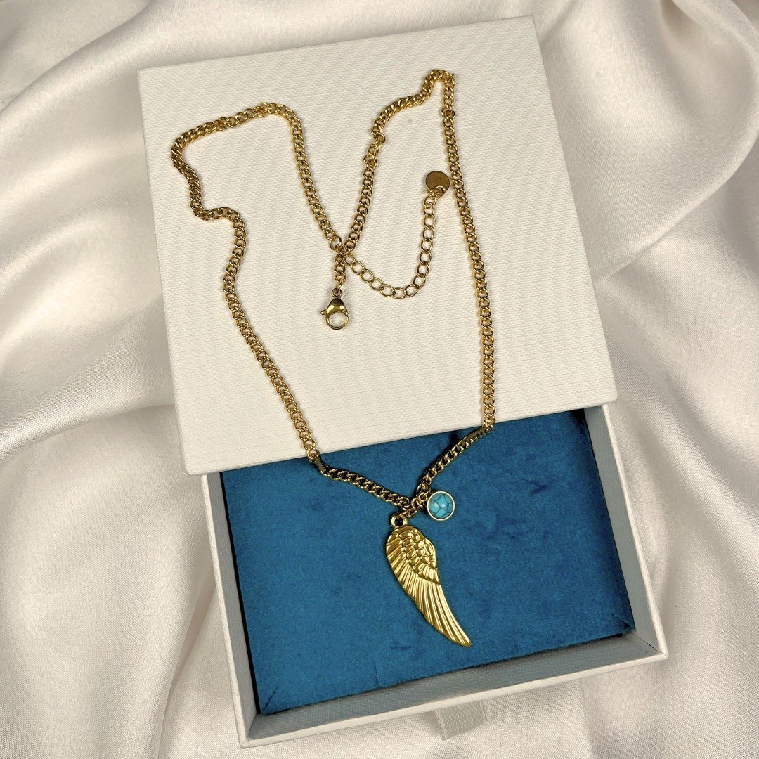 The Winged Whisper Necklace captures the beauty of freedom and guidance with its intricately designed golden wing pendant. Paired with a turquoise charm, this necklace brings together elegance and symbolism, representing strength, transformation, and serenity.